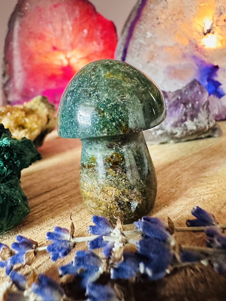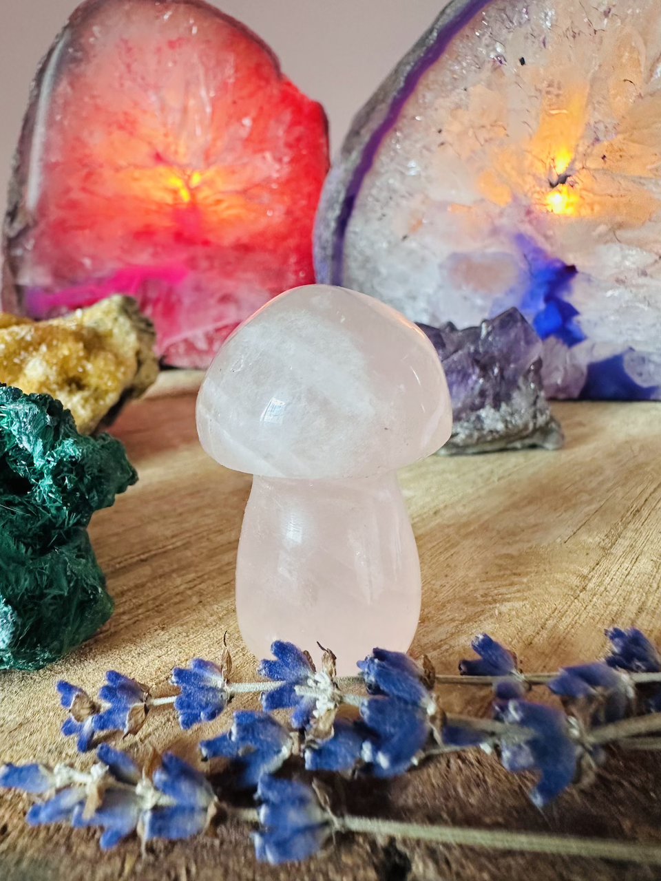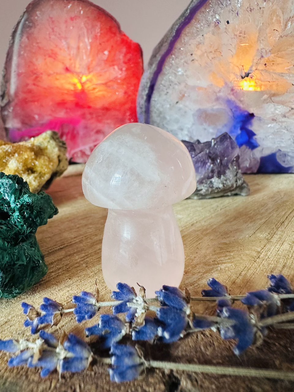 Grzyb symbolizuje transformację na wielu poziomach – fizycznym, psychicznymi duchowym. Są źródłem wiedzy i mądrości. Dodatkowo Kwarc Różowy to minerał pełen delikatności, empatii i miłości. Jest symbolem serca i niesie ze sobą energetyczną wibrację, która pomaga nam odkrywać prawdziwą wartość miłości, zarówno dla innych, jak i dla siebie. Kwarc Różowy pomaga nam goić rany emocjonalne, łagodzić ból i traumy oraz odbudować naszą pewność siebie. Ten kamień jest idealnym towarzyszem dla osób, które pragną odnaleźć wewnętrzną równowagę i pokój.