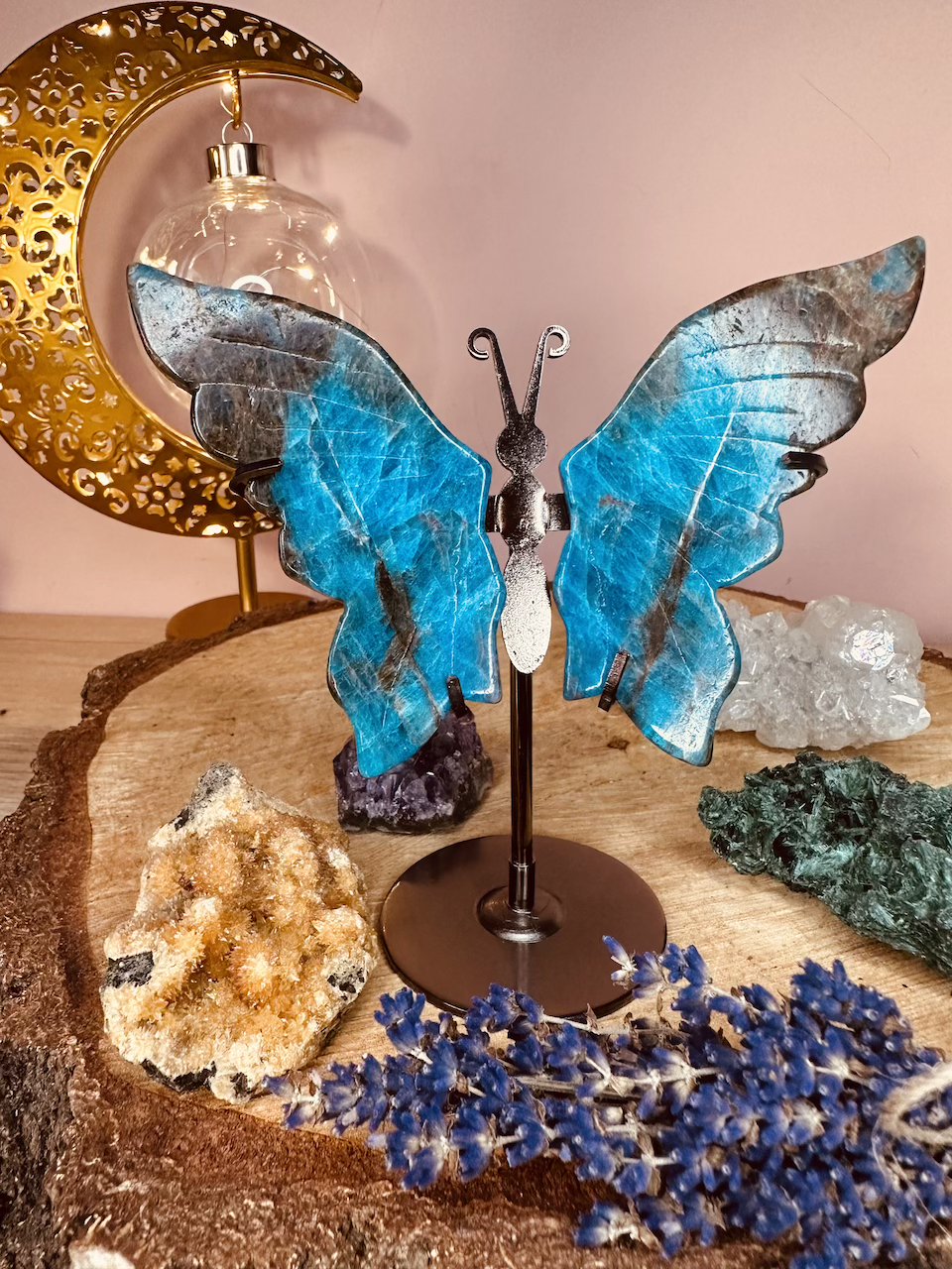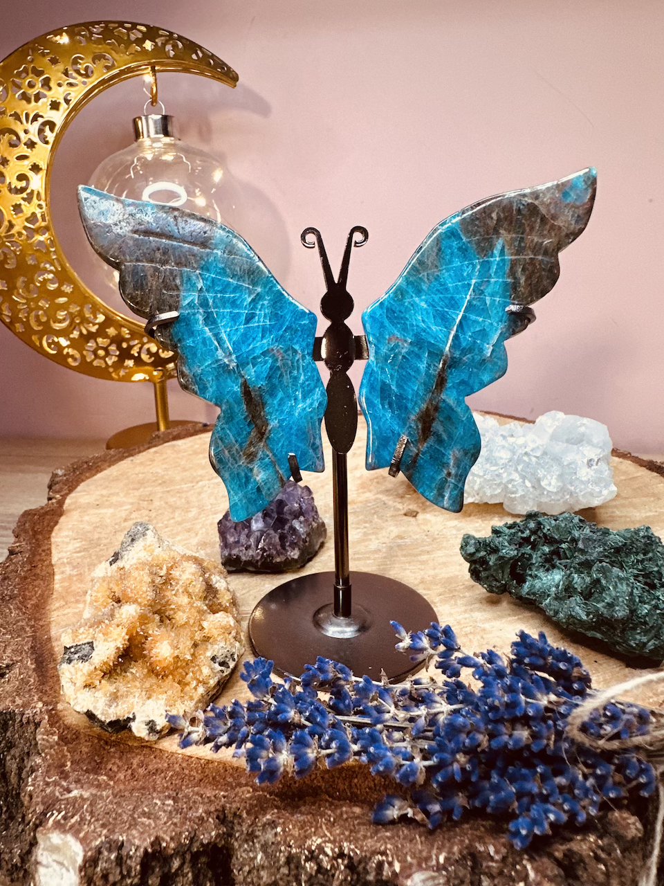 Motyl ze skrzydłami z Apatytu to wyjątkowe połączenie naturalnego piękna kamienia z elegancją metalowej podstawki.  Apatyt jest często używany do wspomagania równowagi emocjonalnej, łagodzenia stresu i niepokoju oraz poprawy nastroju. Posiada zdolności zwiększania jasności myślenia, co może pomóc w podejmowaniu trafnych decyzji i rozwiązywaniu problemów. Dodatkowo pomaga w procesie oczyszczania energetycznego i uzdrawiania, zarówno na poziomie fizycznym, jak i emocjonalnym.