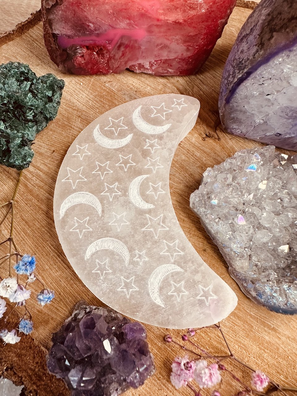 Selenit to kamień przede wszystkim do pracy duchowej.  Pomaga rozbudzić intuicję i uspakaja nasze rozbiegane myśli. Działa ochronnie dla naszej aury. Pomaga zmniejszyć stres, zredukować negatywną energię, dzięki czemu zapewnia spokojną atmosferę, która sprzyja regeneracji.