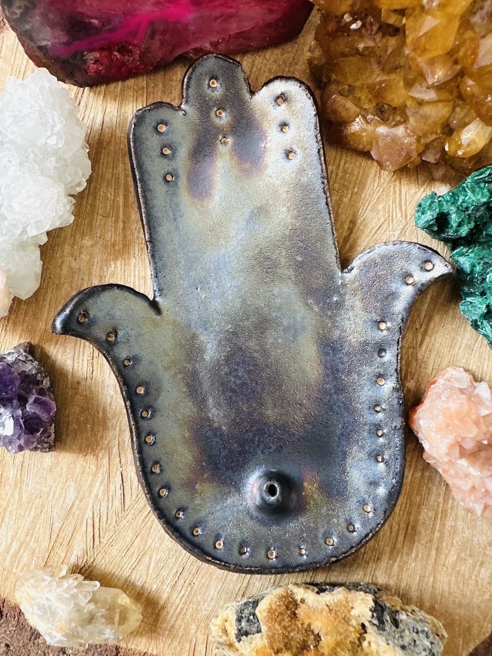 Ceramiczna podstawka pod kadzidła w kształcie Hamsy. Dzięki niej możemy bezpiecznie palić kadzidła, jednocześnie ciesząc się pięknym i inspirującym wzornictwem. To nie tylko praktyczny przedmiot, ale również interesujący element dekoracyjny, który idealnie wpisuje się w różne style wnętrz.