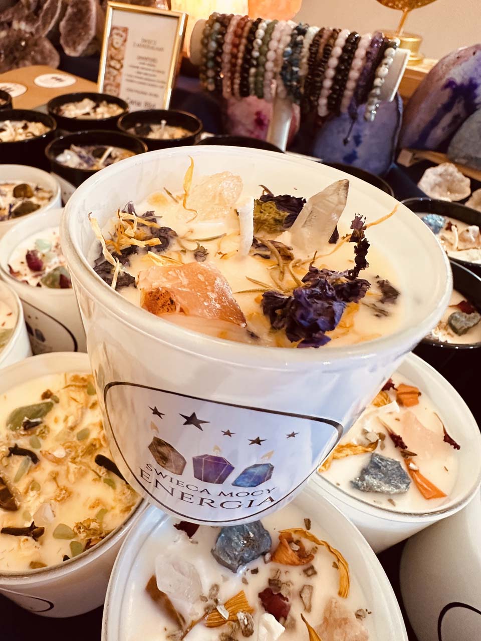 Z dodatkiem naturalnych minerałów – kamienie ukryte w świecy wzmacniają jej energetyczną moc.